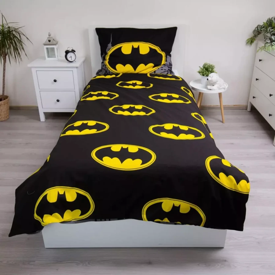 Batman ágyneműhuzat garnitúra - A DC Comics ágynemű tartalmaz egy darab 140×200cm méretű paplanhuzatot és egy darab 70×90 cm méretű párnahuzatot, amely 100% pamut anyagból készült - Az ágyneműn a fekete-sárga szín dominál