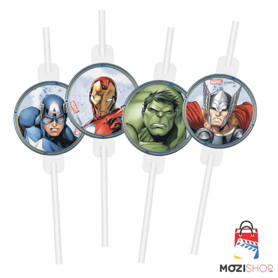 Bosszúállók papír szívószál szett - 4 darabos készlet - A Marvel Avengers szívszálon a legnépszerűbb Bosszúállók karakterek láthatóak, mint Vasember, Amerika Kapitány, Hulk és Thor