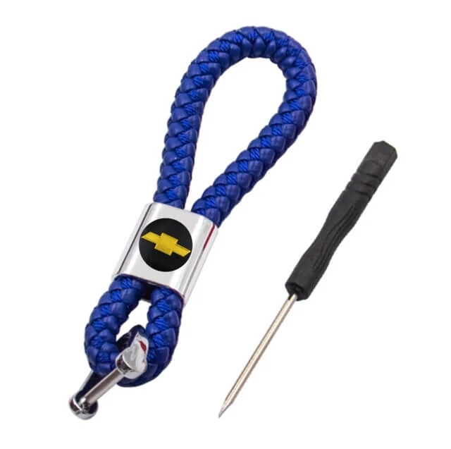 Chevrolet kulcstartó, távirányító tartó fonott műbőr dísszel, biztonsági záras kulcskarikával - 11 cm X 2 cm X 1,7 cm méretben