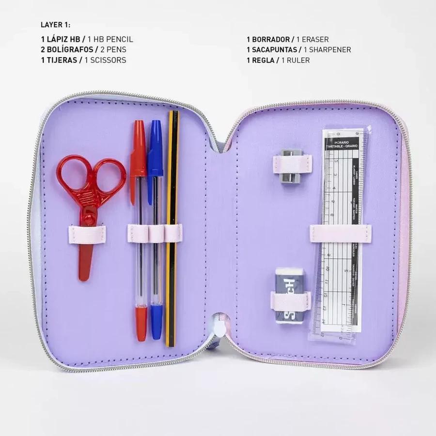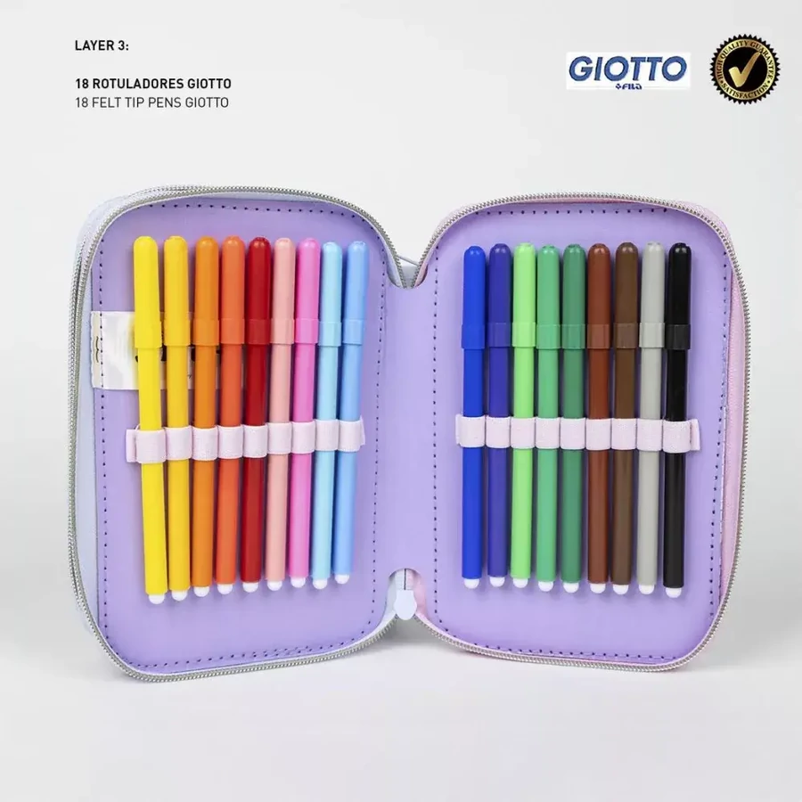 A tolltartó három emeletes kialakítása lehetővé teszi, hogy minden eszközt rendezetten és átláthatóan tároljunk, így könnyen megtalálhatóak a szükséges írószerek. A tolltartó tartalma: 18 db színes ceruza, 18 db színes filctoll, 1 db grafit ceruza, 1 db hegyező, 1 db radír, 2 db toll, 1 db vonalzó és 1 db olló.