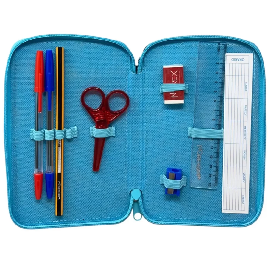 A tolltartó három emeletes kialakítása lehetővé teszi, hogy minden eszközt rendezetten és átláthatóan tároljunk, így könnyen megtalálhatóak a szükséges írószerek. A tolltartó tartalma: 18 db színes ceruza, 18 db színes filctoll, 1 db grafit ceruza, 1 db hegyező, 1 db radír, 2 db toll, 2 db vonalzó, 1 db órarend és 1 db olló.