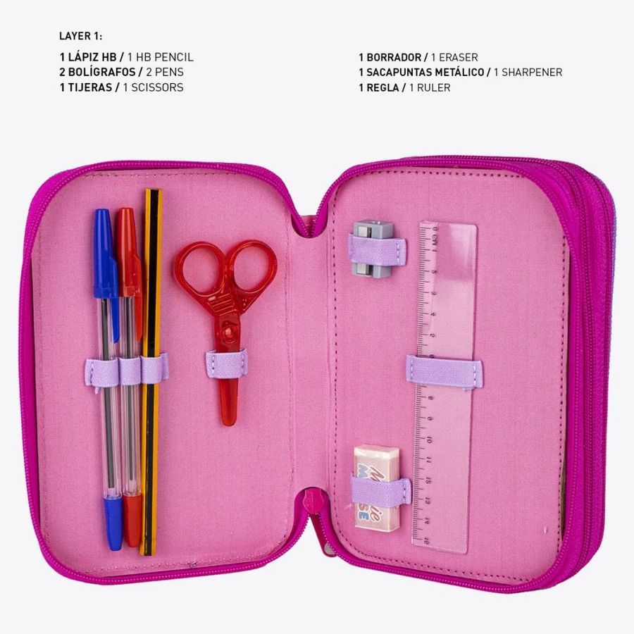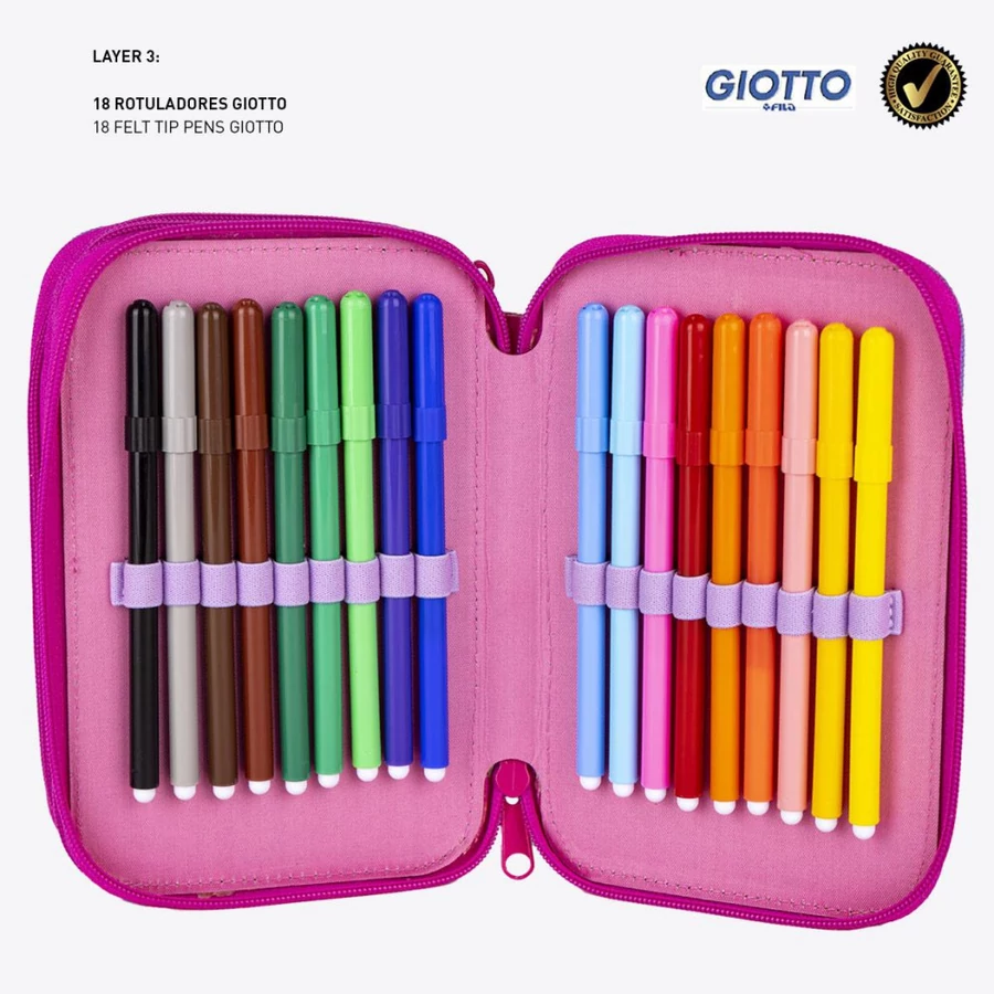 A tolltartó tartalma: 18 db színes ceruza, 18 db színes filctoll, 1 db kék toll, 1 db piros toll, 1 db grafitceruza, 1 db radír, 2 db vonalzó, 1 db hegyező
