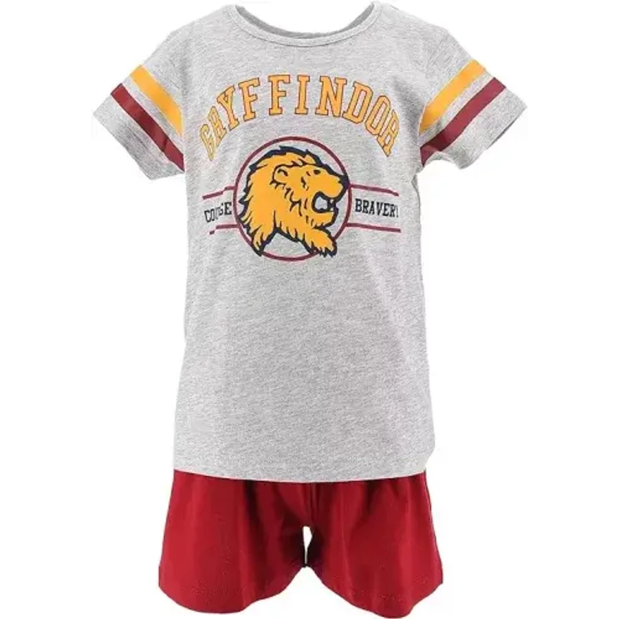 Ez a Harry Potter pizsama két részből áll: egy rövid szárú alsóból és egy rövid ujjú felső részből. A felsőrész szürke alapszínnel rendelkezik, amelyen a híres Gryffindor ház oroszlánja díszeleg, a ház nevével és jelmondatával együtt. A felsőrészen található Gryffindor felirat mellett a "Courage" (Bátorság) és "Bravery" (Hősiesség) szavak is megjelennek, kiemelve a Gryffindor ház értékeit. A pizsama nadrágja élénk bordó színű, amely tökéletesen illeszkedik a felsőrész színvilágához, és összhangot teremt a Gryffindor ház színeivel.