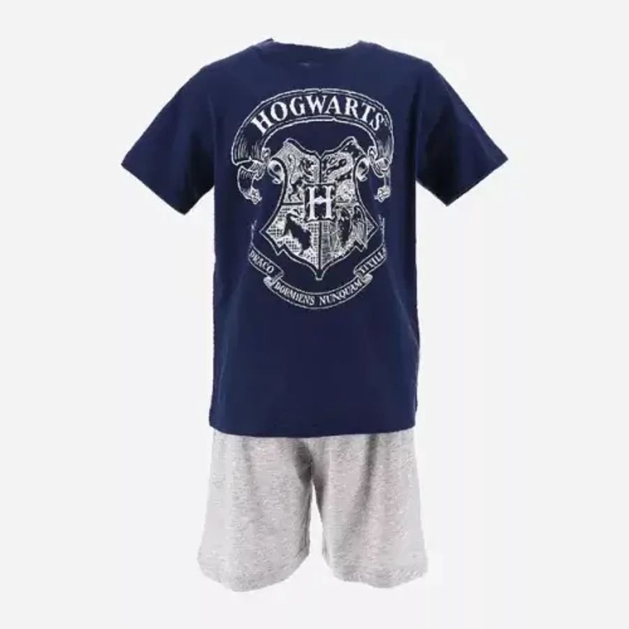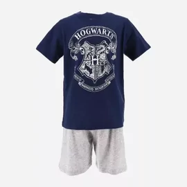 Harry Potter gyerek rövid pizsama - 116-os méret - Hogwarts - A Harry Potter pizsama két részből áll, egy rövid szárú alsóból és egy rövid ujjú felső részből, a felső 100% pamut anyagból, a nadrág 85% pamut és 15% viszkóz anyagból készült