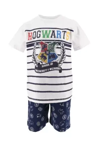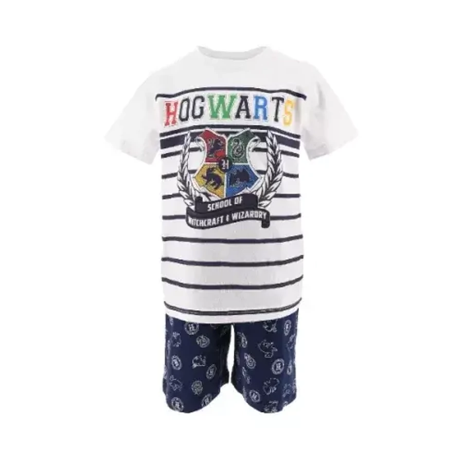 Harry Potter gyerek rövid pizsama - 140-es méret - Hogwarts - A Harry Potter pizsama két részből áll, egy rövid szárú alsóból és egy rövid ujjú felső részből, 100% pamut anyagból, a felső 95% pamut és 5% viszkóz anyagból készült