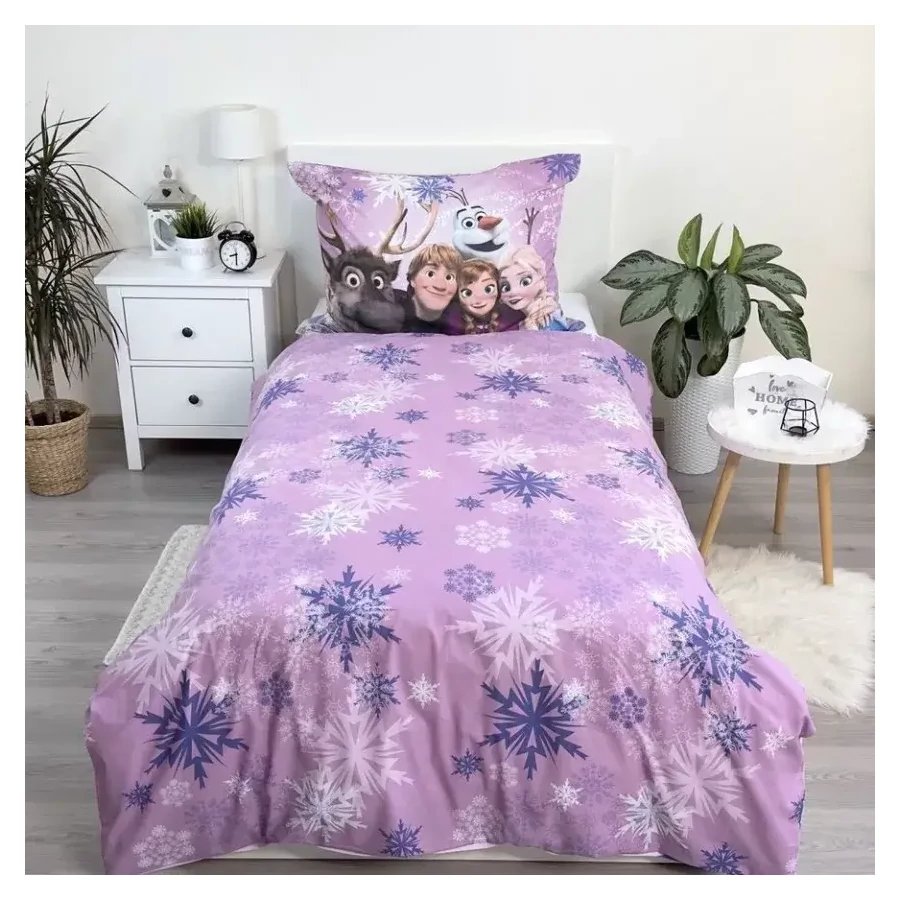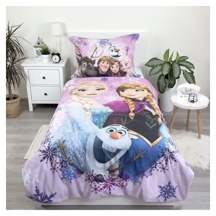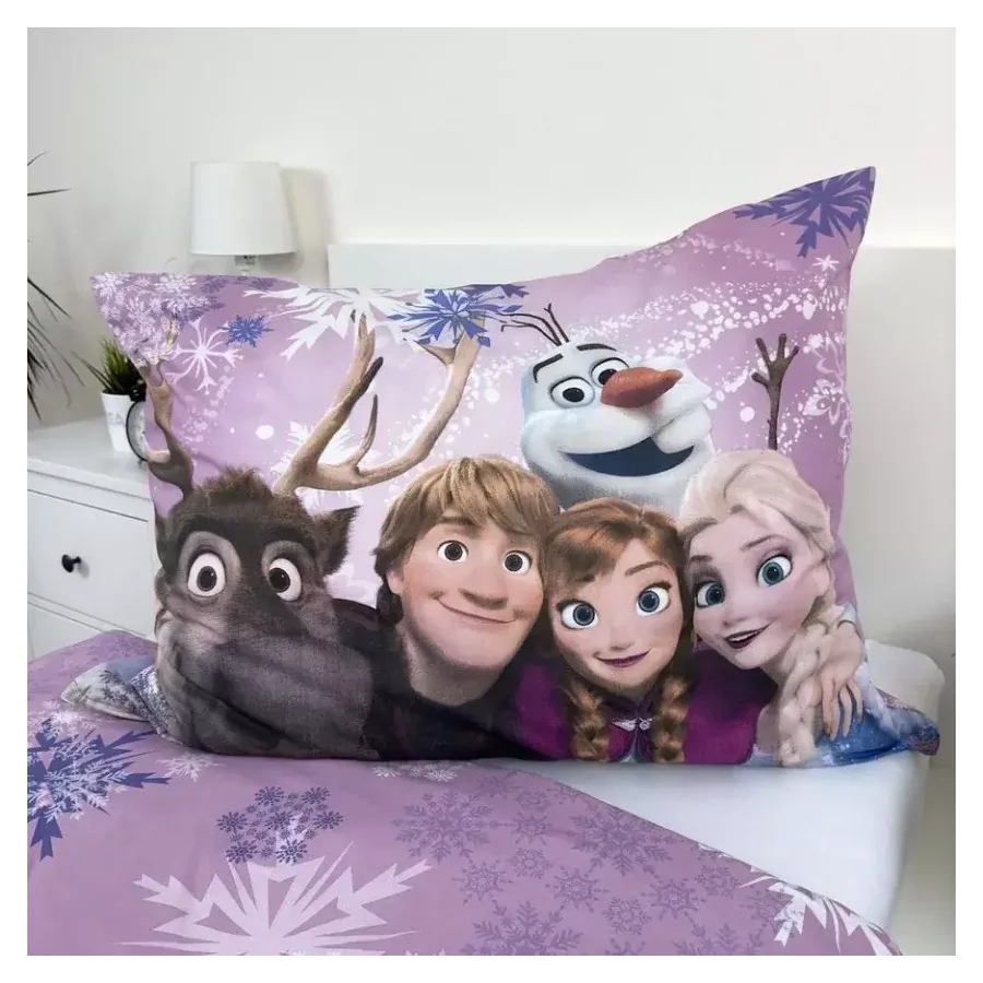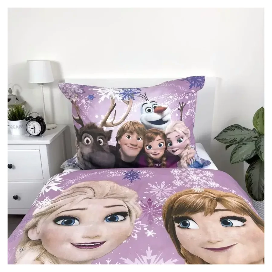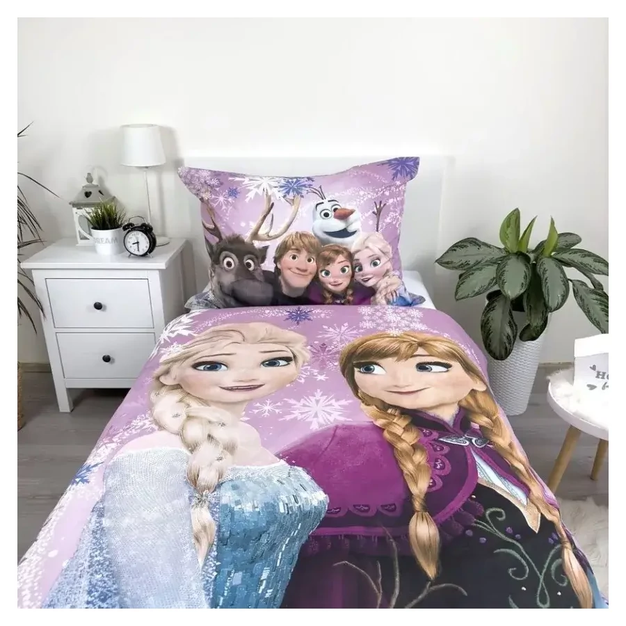 Az ágyneműhuzat garnitúra magával ragadja a gyerekeket a hóbuckák és jeges tájak világába, ahol Anna, Elsa és barátaik mesés kalandjait élhetik át. Az élénk és vidám színekkel díszített párnahuzat és paplanhuzat azonnal felvidítja a gyerekszobát, és minden reggel mosolyt csal az arcokra.