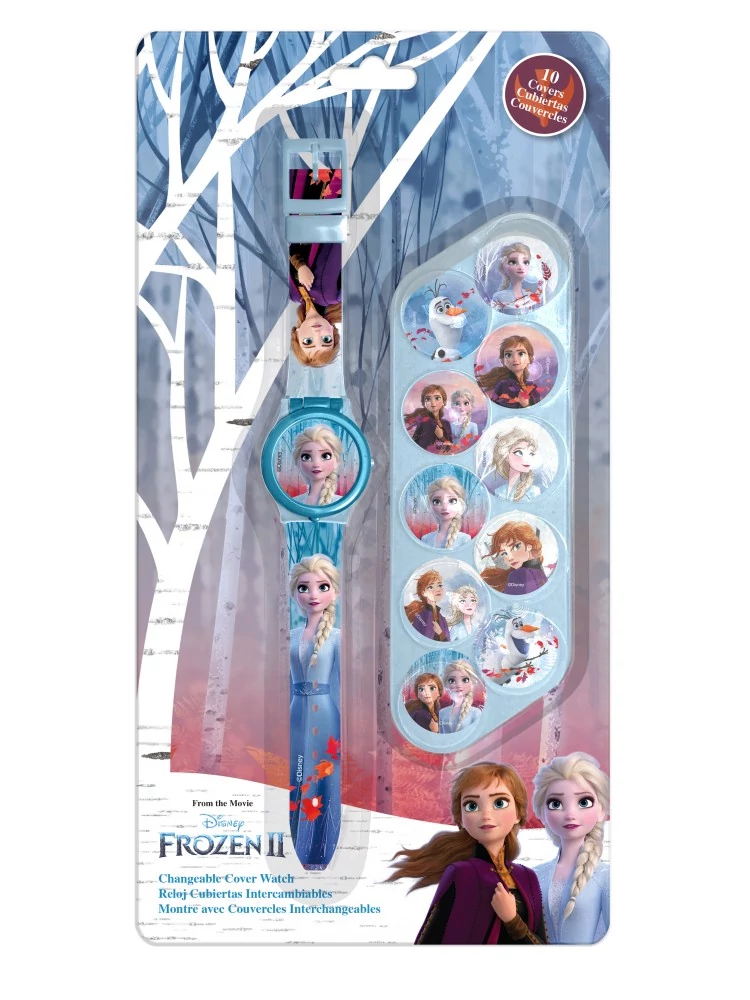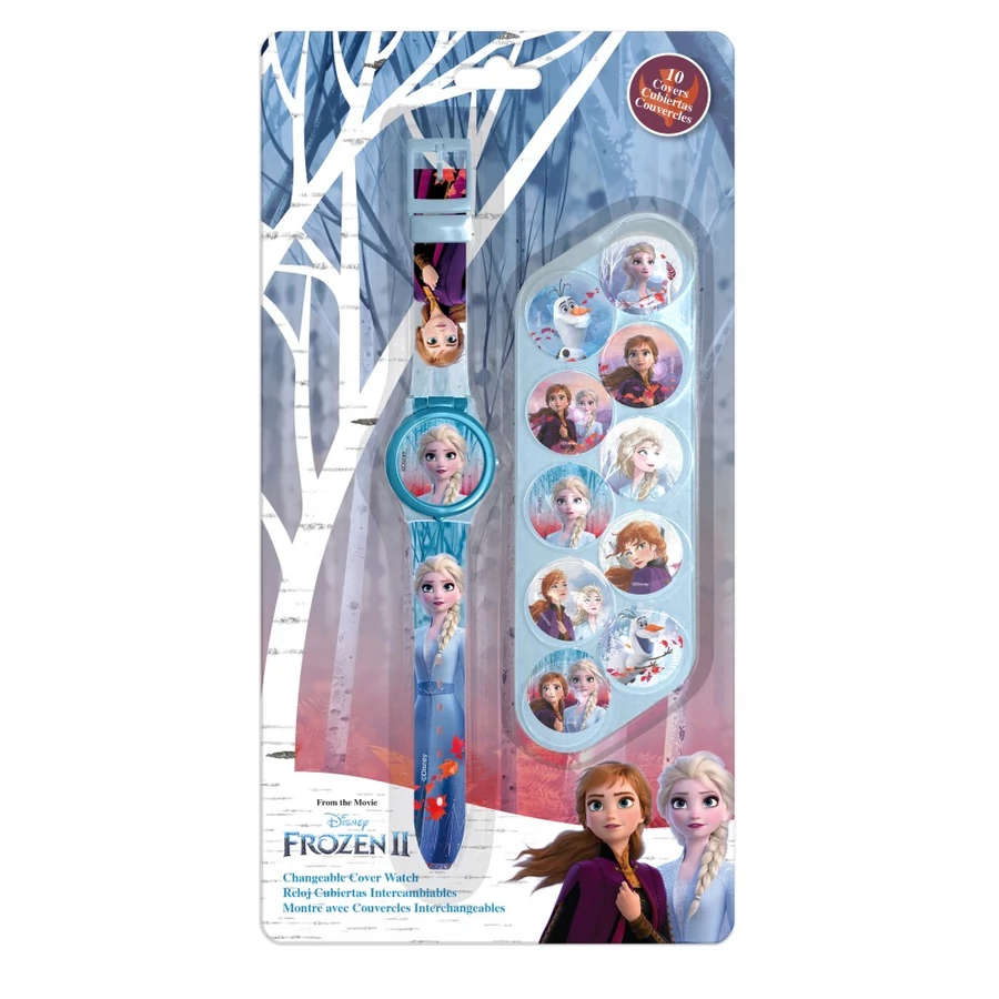 Az órán felnyitható borító van, hogy megvédje az óra lapját. A borító cserélhető 10 féle Disney Jégvarázs mintára.