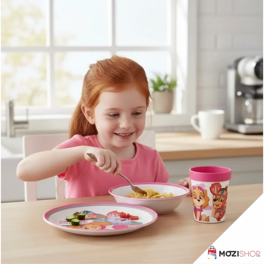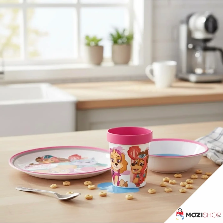 Ez nem csupán egy egyszerű műanyag gyerek tányér szett. A tervezésnél a szülők kényelme és a gyerekek biztonsága volt a fő szempont. A csomag tartalmaz egy tágas lapostányért, egy mély műzlis tálkát és egy tökéletes fogású, 260 ml-es poharat. A "Superpowers" minta nemcsak dekoráció, hanem inspiráció is: a kislányok kedvenc kutyusai, Skye és Everest díszítik az edényeket, így minden falat egy újabb közös küldetés a hősökkel.