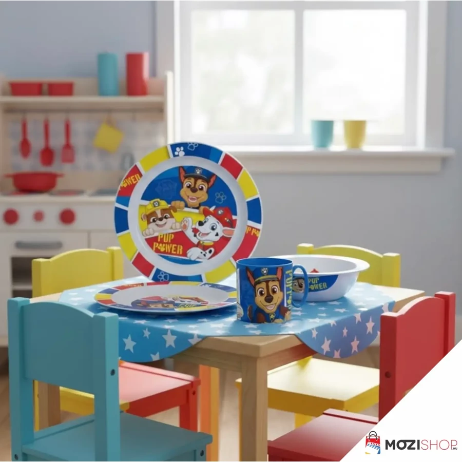 A Mancs őrjárat műanyag étkészlet nem csupán egy szimpla tálalóeszköz, hanem belépőjegy a kedvenc kutyusok világába. A készlet egy lapostányért, egy praktikus peremes müzlis tálat és egy 265 ml-es bögrét tartalmaz, így minden fogáshoz megvan a tökéletes társ. A látványos, kék alapú dizájnon Marshall, Chase és Rubble várja a bevetést, a "Pup Power" felirat pedig minden falatnál extra motivációt ad. A domináns kék, sárga és piros színek azonnal feldobják a gyerekszoba vagy a konyha hangulatát.