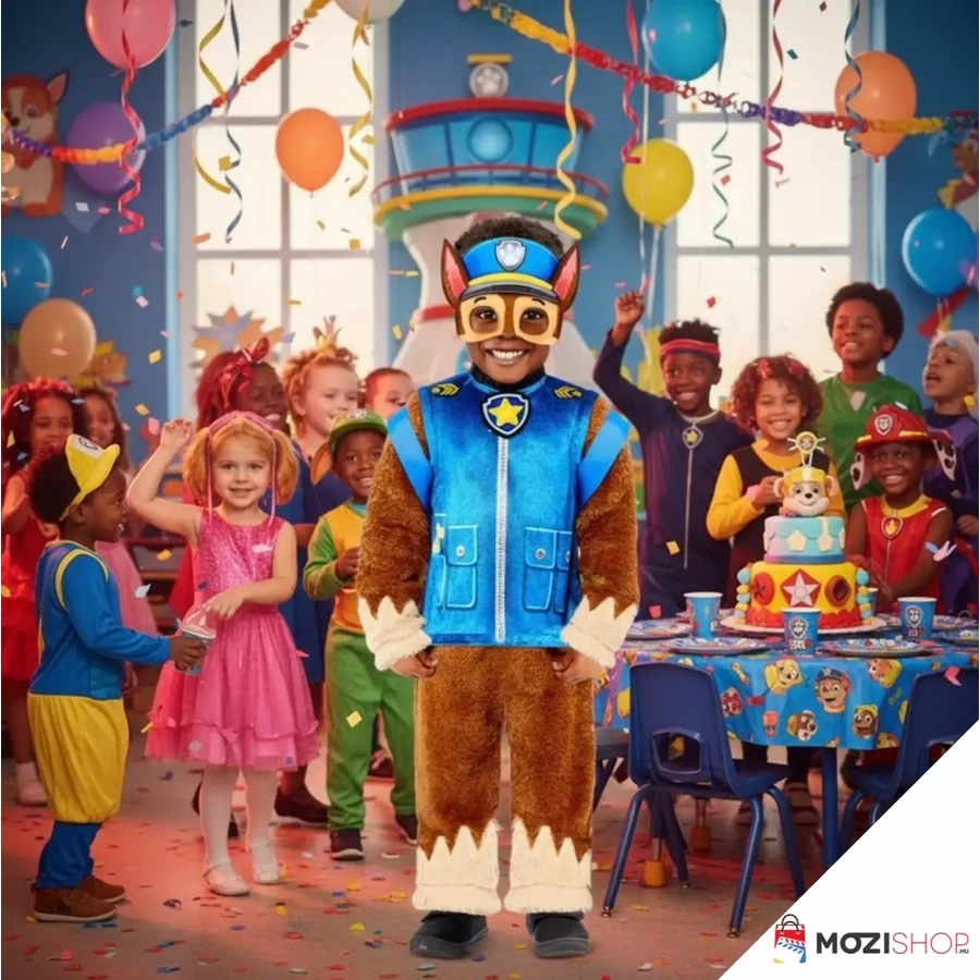Öltsd magadra a kedvenc animációs sorozatod egyik főhősének a jelmezét! A népszerű Mancs őrjárat Chase kutyusa látja el a rendőri feladatokat, és most itt a lehetőség hogy a jelmezverseny idejére te magas legyél az okos és bátor rendőrkutya. A Paw Patrol Chase jelmez overálja pillanatok alatt egyenruhás németjuhász kutyát farag belőled, és már csupán a fülekkel ellátott maszkot kell felvenned. A nagyszerű jelmez 100% poliészter anyagból kiváló minőségű, aprólékos kidolgozással készült, így remek választás a farsangi bálra, valamint a Halloween alkalmi beöltözésre.