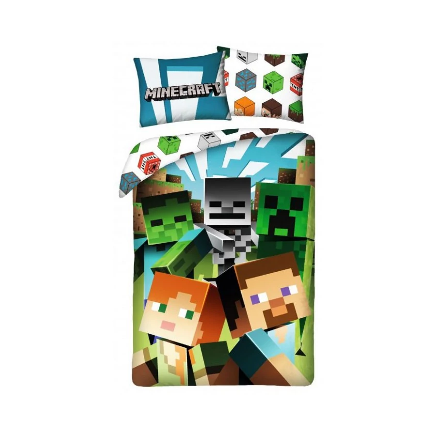 Minecraft ágyneműhuzat garnitúra - A Minecraft ágynemű szett tartalmaz egy darab 140 cm X 200 cm méretű paplanhuzatot és egy darab 70 cm X 90 cm méretű párnahuzatot, az I. osztályú garnitúra 100% pamut anyagú - Az ágynemű mindkét oldalán különböző Minecraft grafika látható
