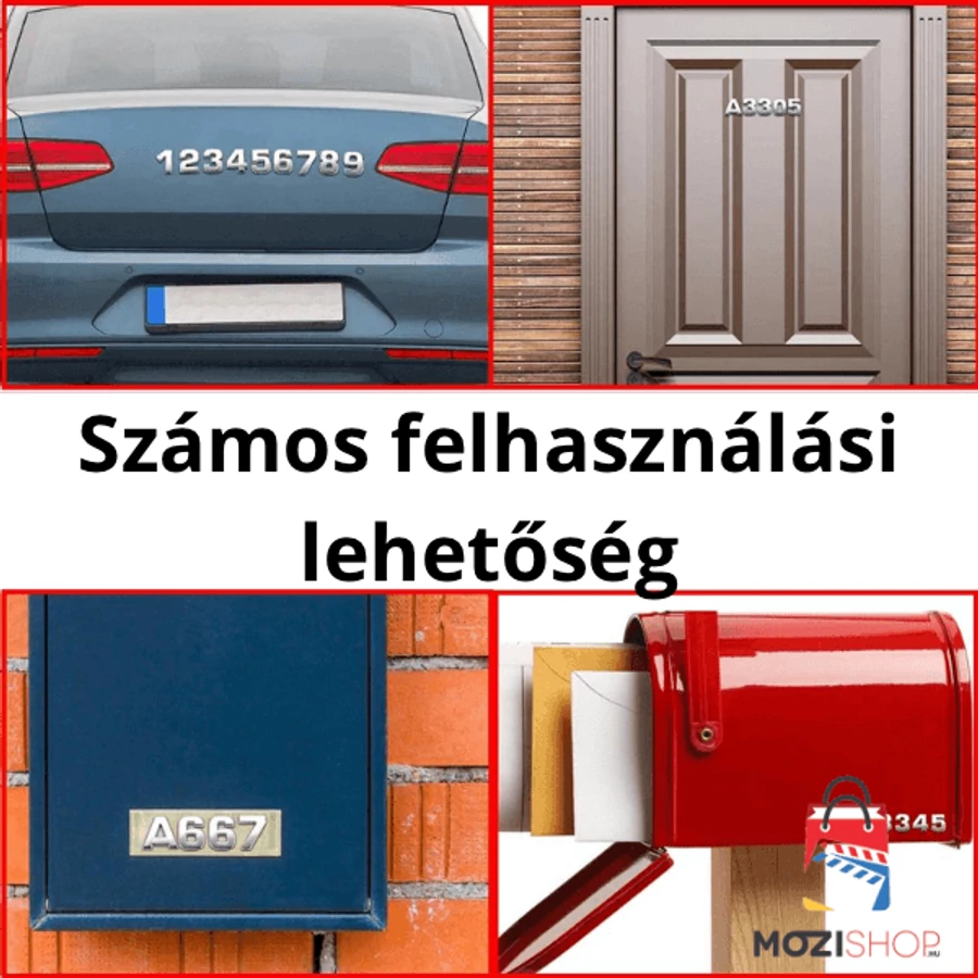 Az öntapadó betű és szám matrica egy remek kiegészítő az autójáért rajongók számára. A matrica 2,5 cm X 2,3 cm X 0,2 cm méretű. Az öntapadó matricák felhelyezése könnyű és egyszerű , jól tartó kétoldalas ragasztóval tartós megoldást kínál. A betű és szám matrica króm hatású, így emeli gépjárművének megjelenését. A betűk és számok nem csupán gépjárműveken használhatóak, tökéletes megoldás ajtókon, postaládákon különböző feliratok megjelenítésére.