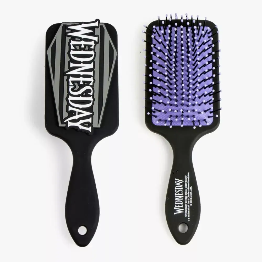 A szürke hétköznapok is lehetnek stílusosak, ha a reggeli készülődéshez egy különleges hajkefét használunk. Bemutatjuk a Wednesday inspirálta hajkefét, amely nemcsak egy egyszerű eszköz a hajformázáshoz, hanem egyedi megjelenésével minden kislány és rajongó számára izgalmas kiegészítővé válik. Ez a hajkefe 9,5 cm x 23,5 cm méretű, így tökéletes választás a kisebb kezek számára is. Ideális méretének köszönhetően könnyen használható, és kiválóan alkalmas mindennapos hajformázásra, fésülésre.